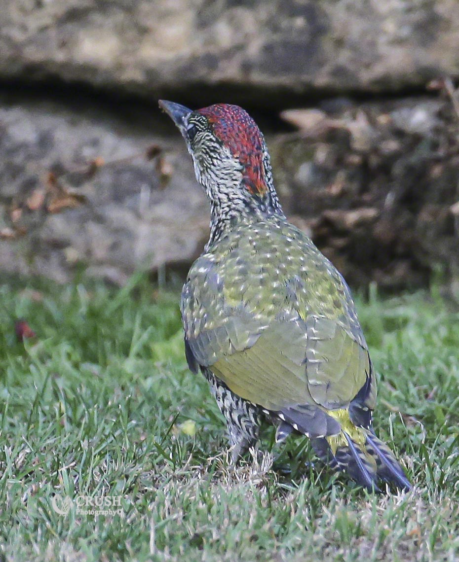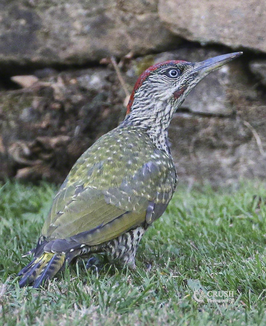 The green woodpecker is olive-green, with a yellow rump, red crown and black around the face. Males have a red ‘moustache’ edged by black, but females have an all-black moustache.